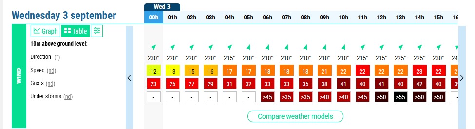 2 Sep – still here and glad we haven’t gone out. This morning we had torrential rain – Windy had it at 50mm/hr – tomorrow’s forecast is dire: