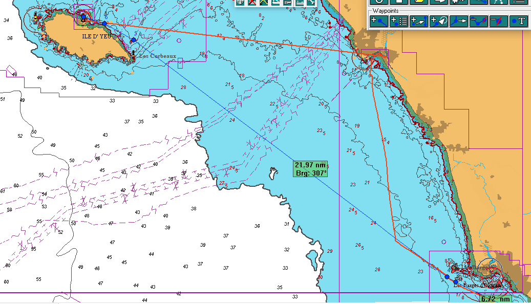 26-30 Aug Port Joinville, Ile de Yeu . The chart has it as 43nm, we covered it in 6 1/2 hours with a maximum SOG of 8kn. The average speed was 6.6kn 🙂